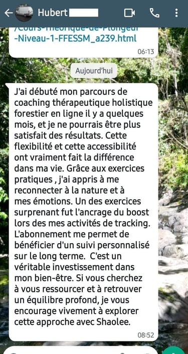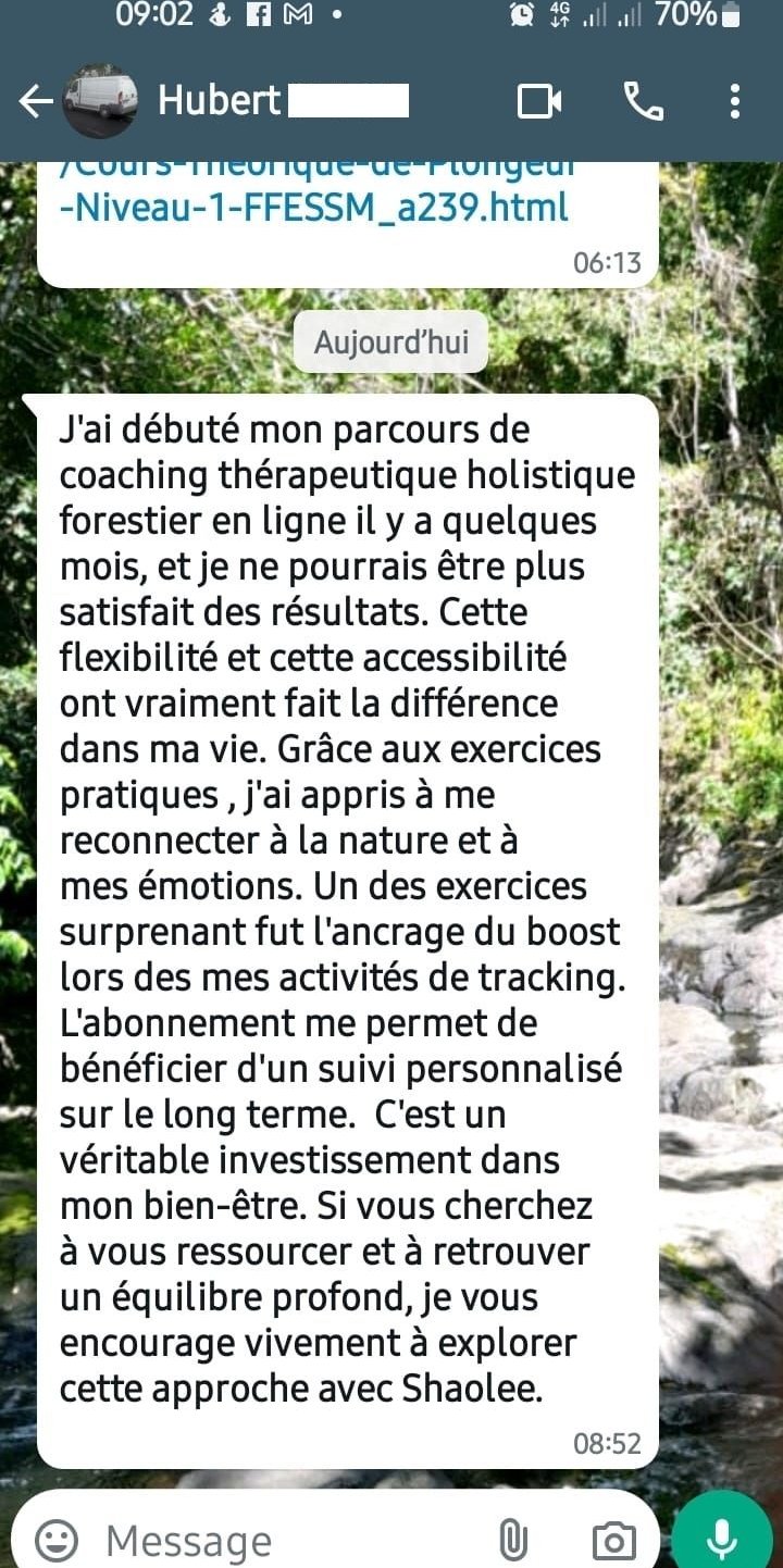 Entre terre et conscience, Charly m'accompagne à me reconnecter à moi-même grâce à des expériences immersives en forêt tropicale. J'avance ...mais quelquechose s'est deconnecté (fatigue intérieure, perte de sens, mental saturé, corps oublié. Je sais que je dois changer quelque chose mais je ne sais plus comment.